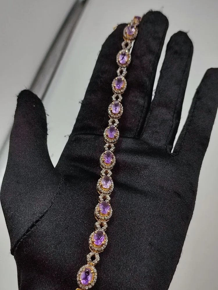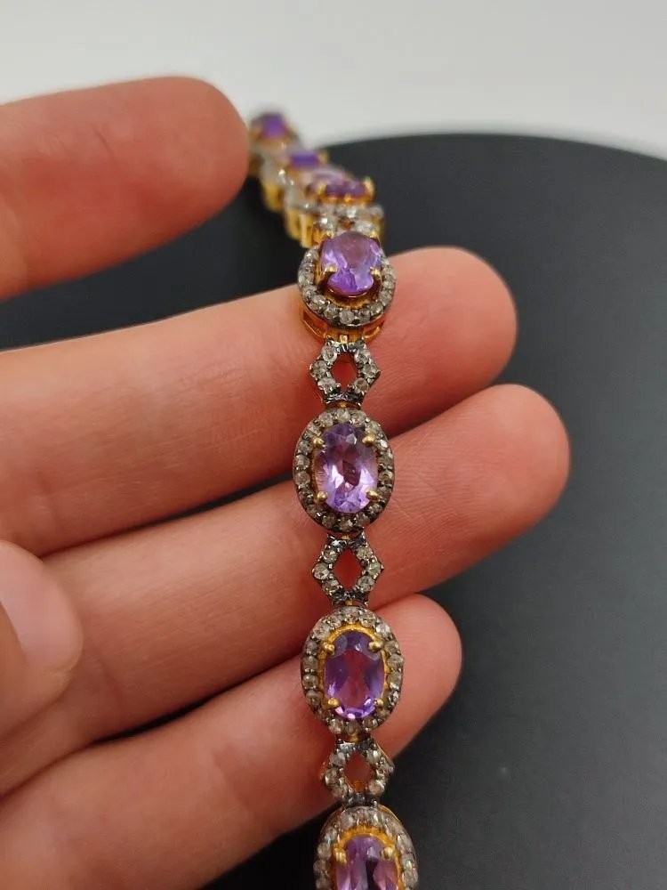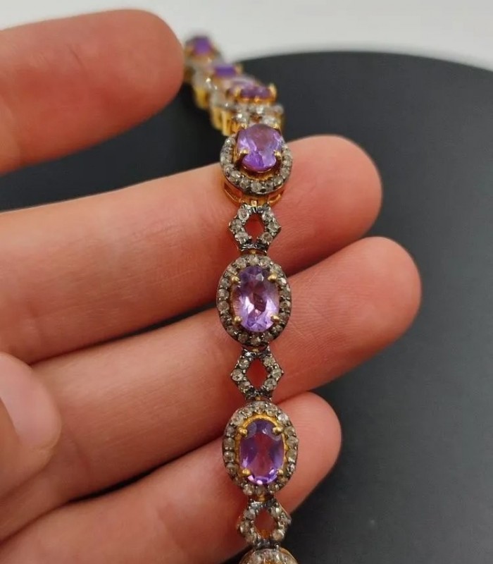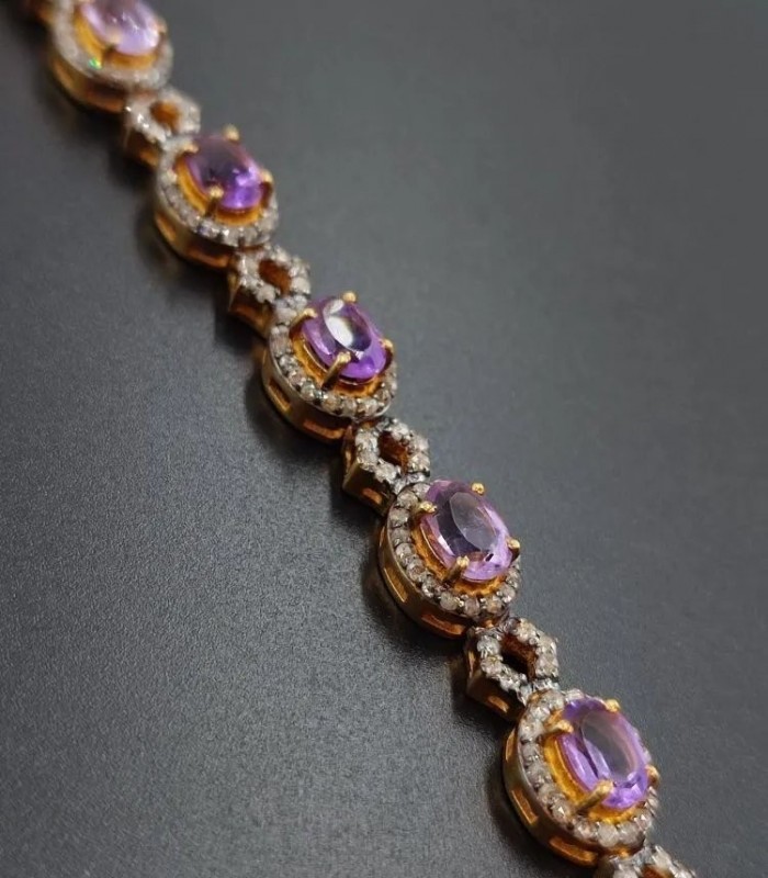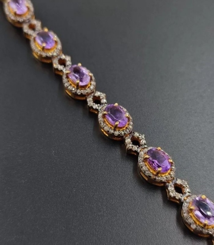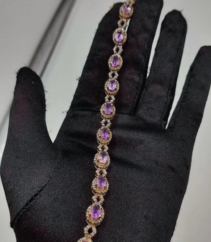 Orjinal Elmas ve Amatist Taşlı Harika İşçilikli 925 Ayar Gümüş Bileklik.