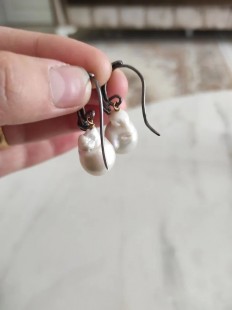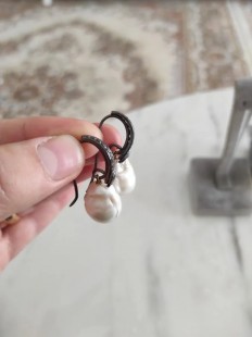 925 Gümüş, Doğal Barok İnci v Elmas Sallantılı Küpe