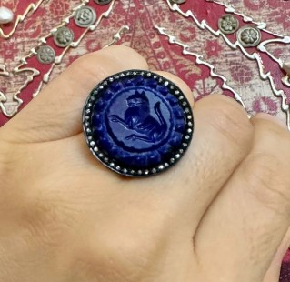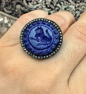925 Gümüş, El İşlemli, Aslan Motifli Lapis v Elmas Yüzük