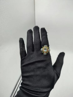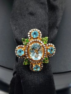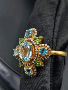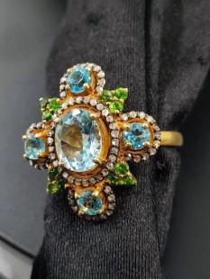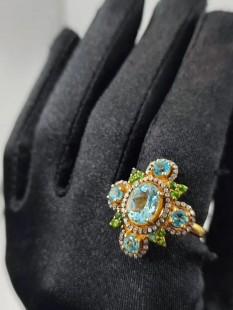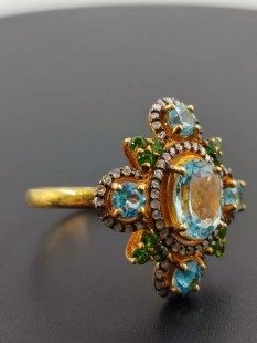 925 Gümüş, Mavi Topaz, Peridot İşçilikli Elmas Yüzük