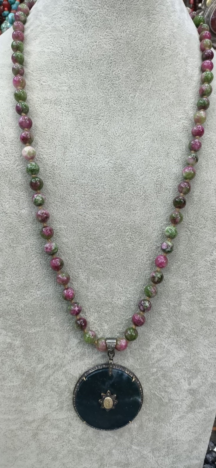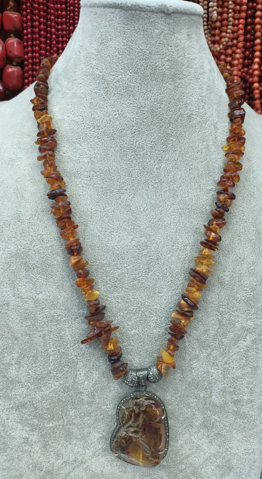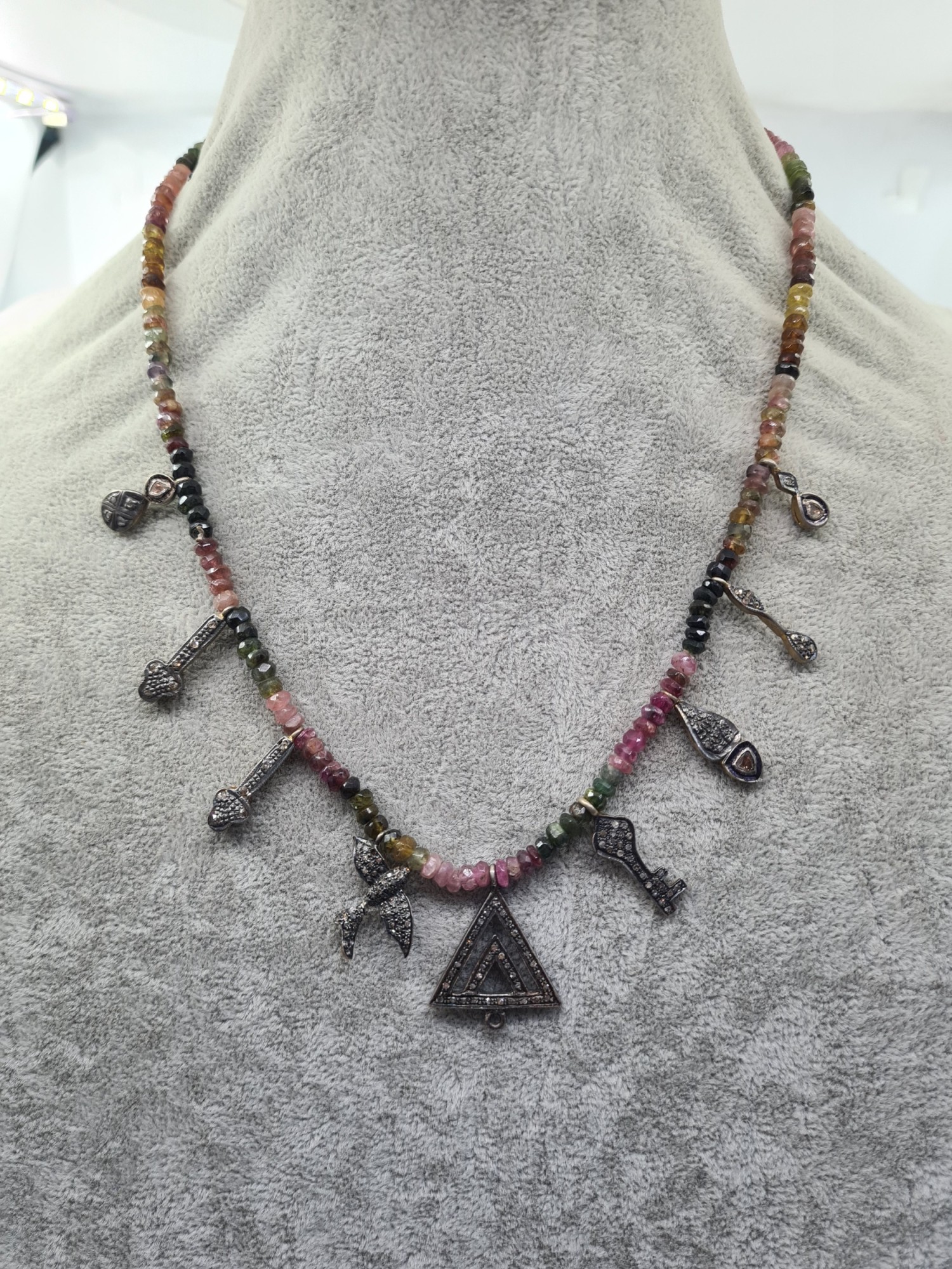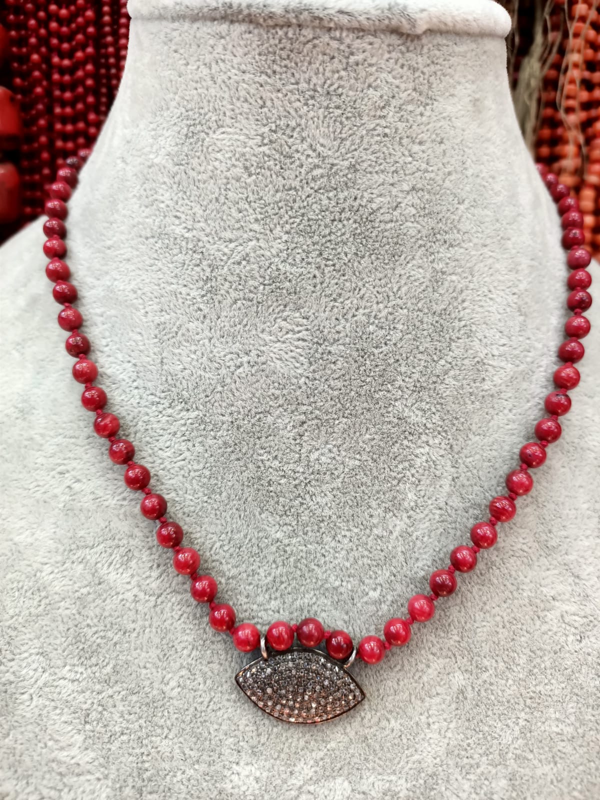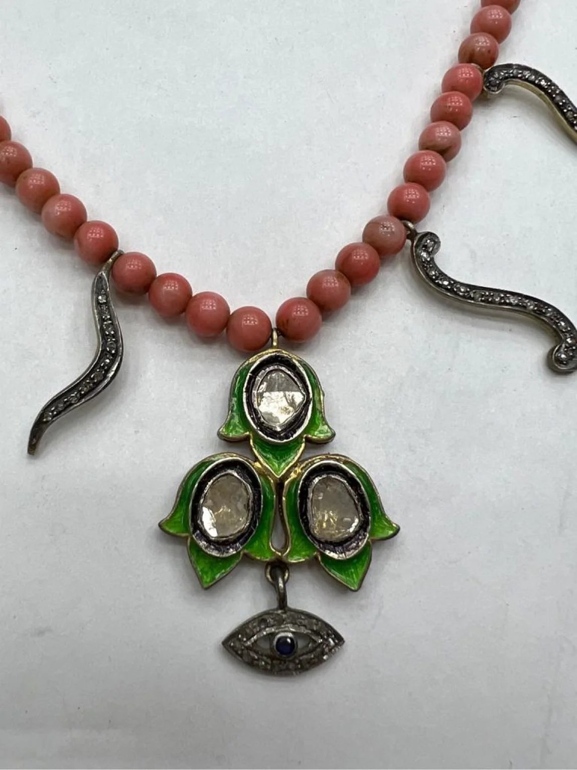925 Gümüş, Mine İşlemli, Mercan ve Elmas Kolye