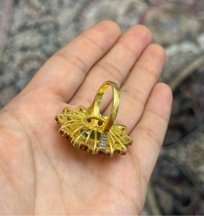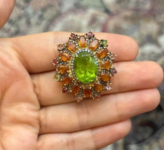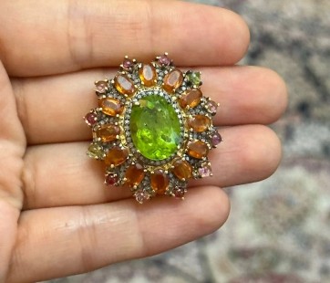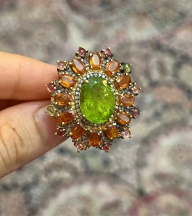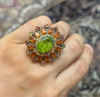 925 Gümüş, Peridot, Kynite, Turmalin ve Elmas Yüzük