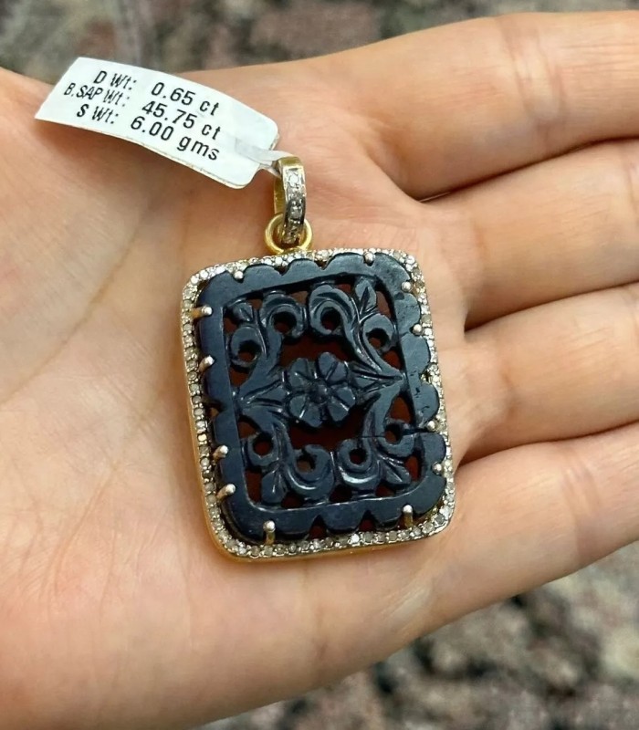 925 Gümüş, İşlemli Doğal Koyu Safir v Elmas Kolye Ucu