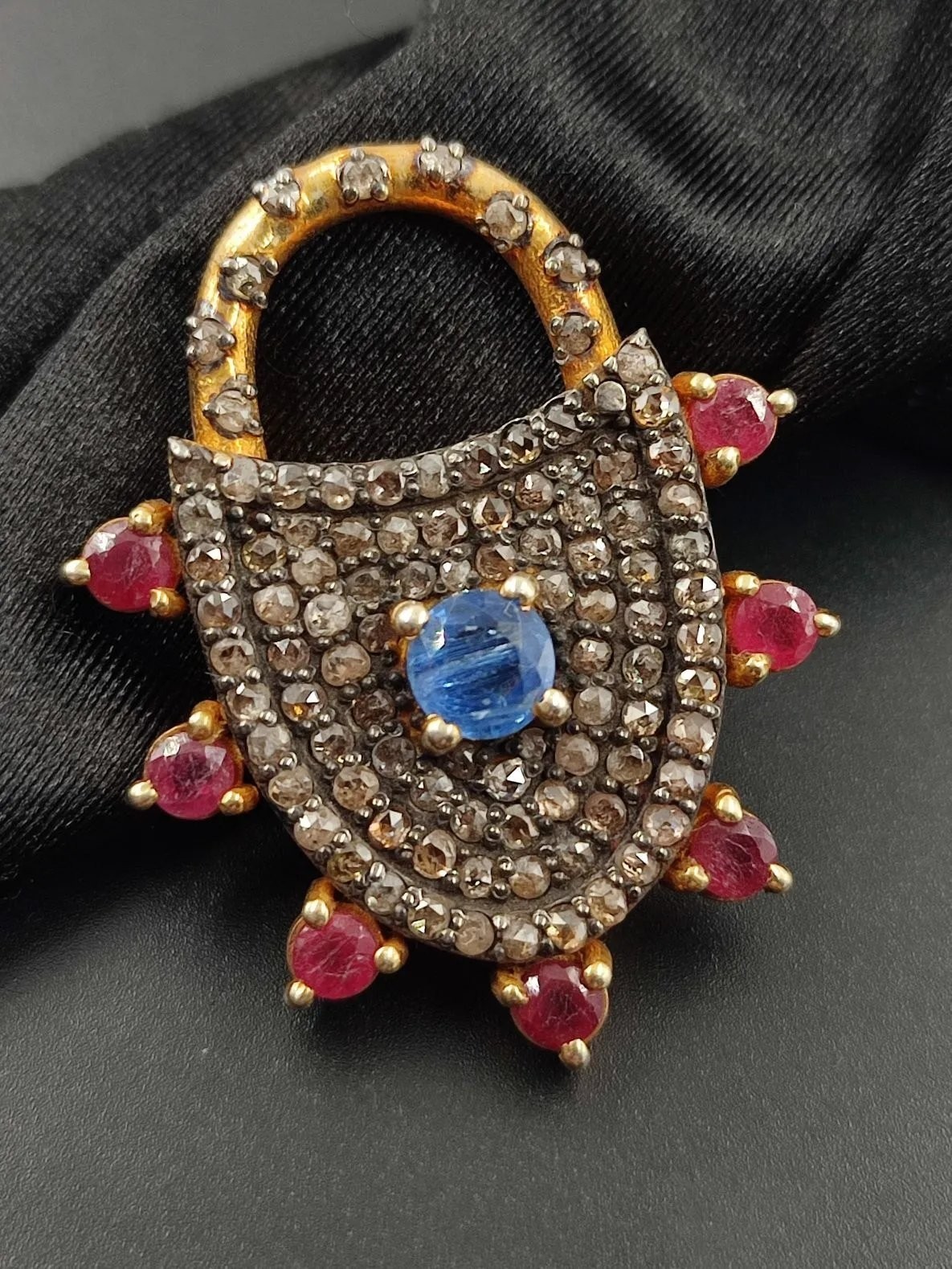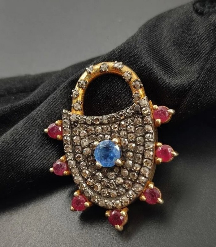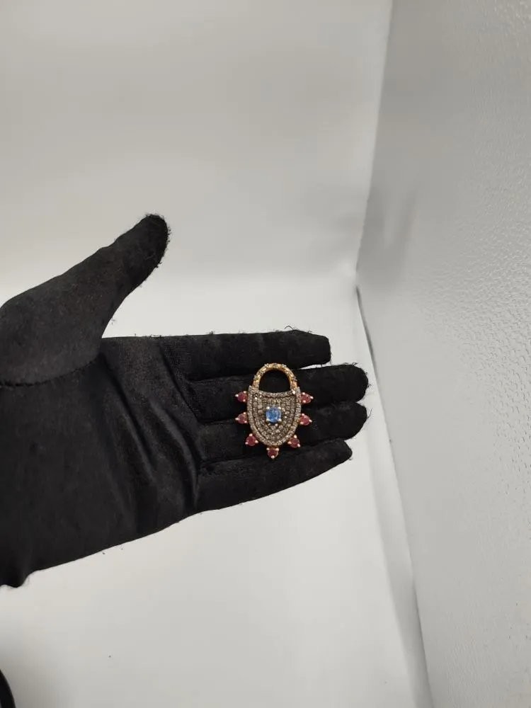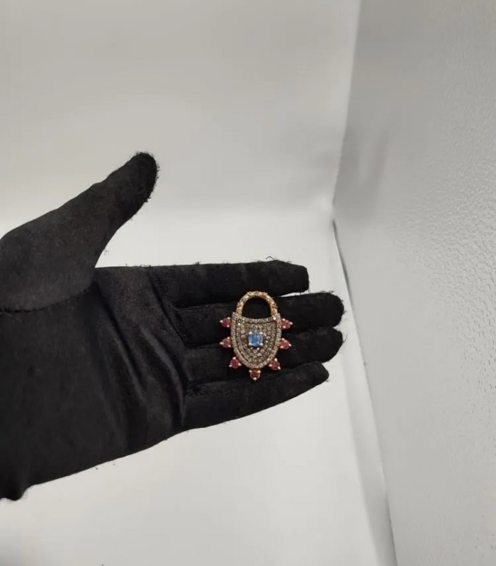 925 Gümüş, Doğal Tanzanit, Yakut ve Elmas İşçilikli Kilit Model Kolye Ucu.