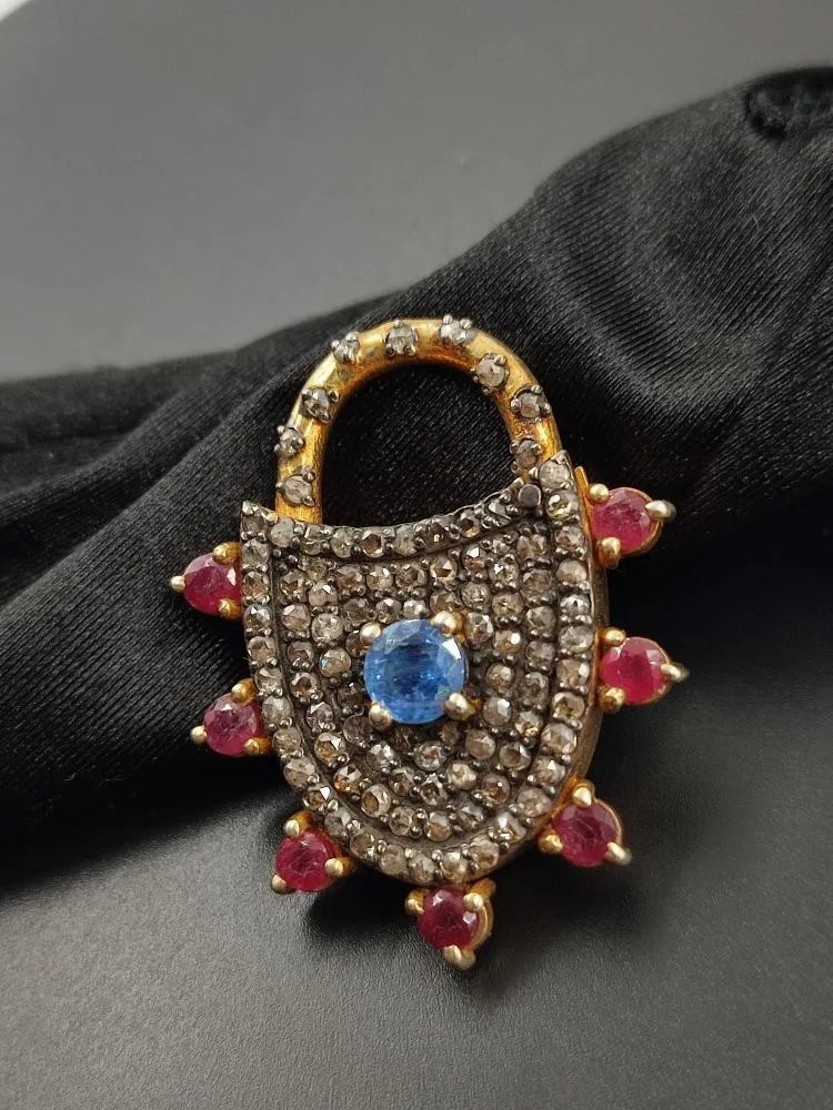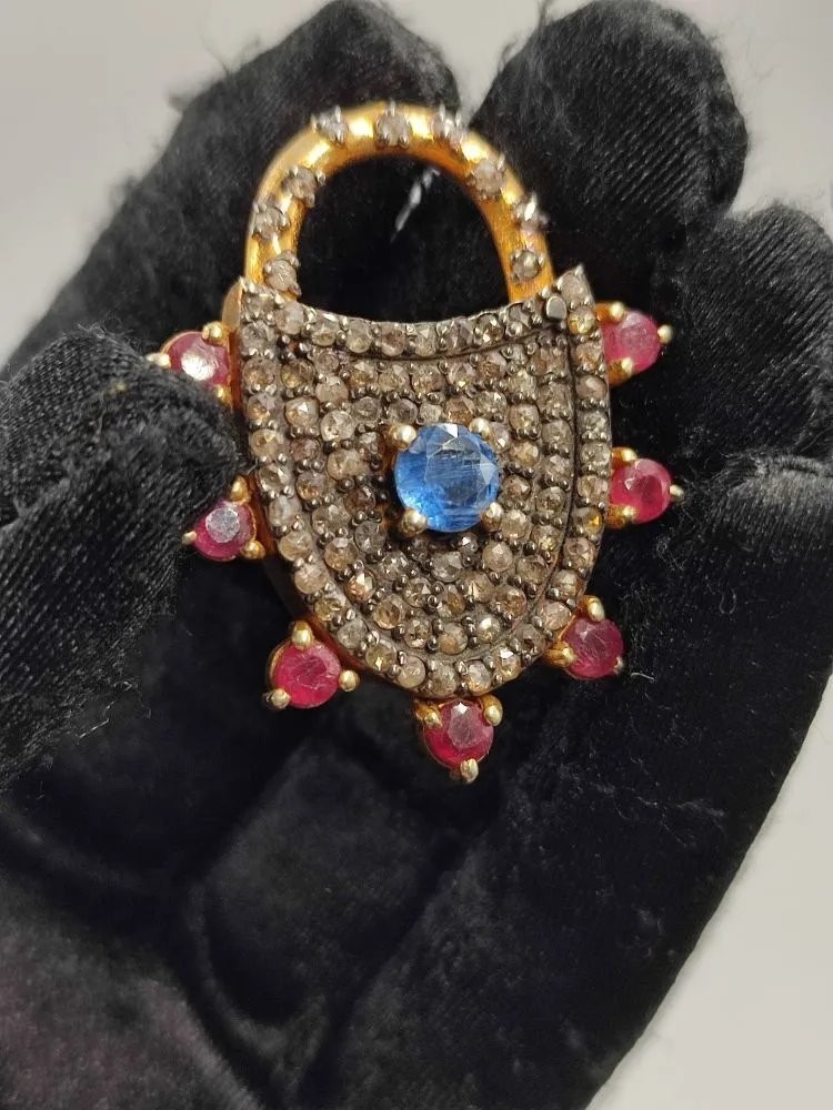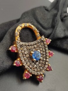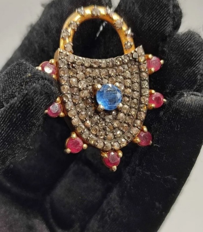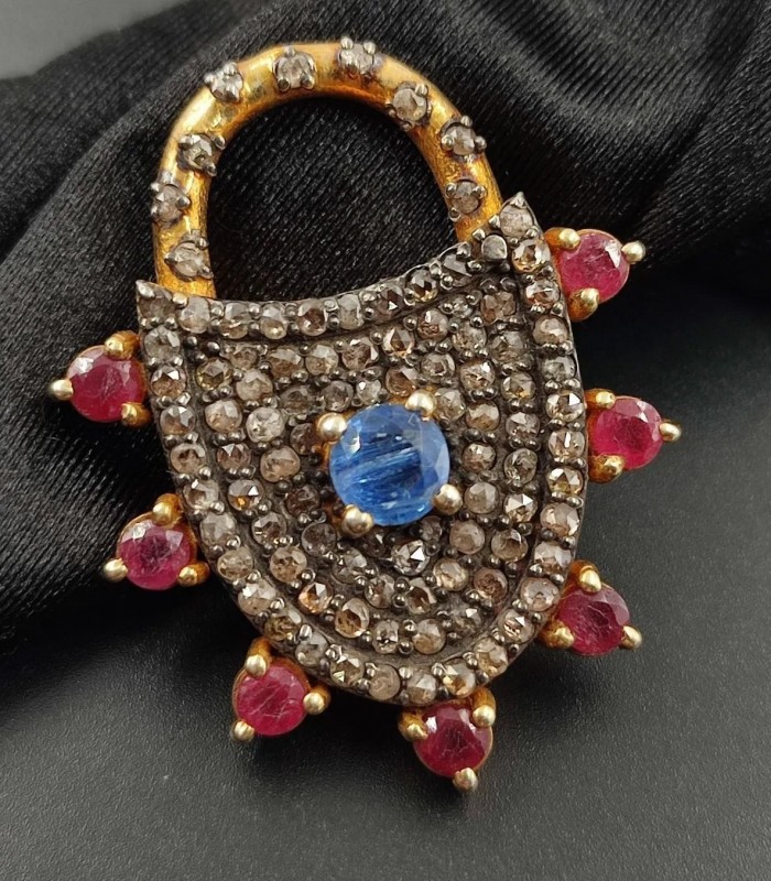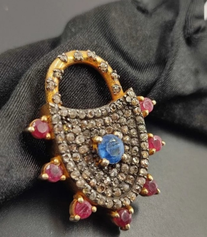 925 Gümüş, Doğal Tanzanit, Yakut ve Elmas İşçilikli Kilit Model Kolye Ucu.
