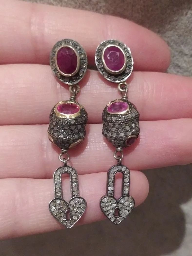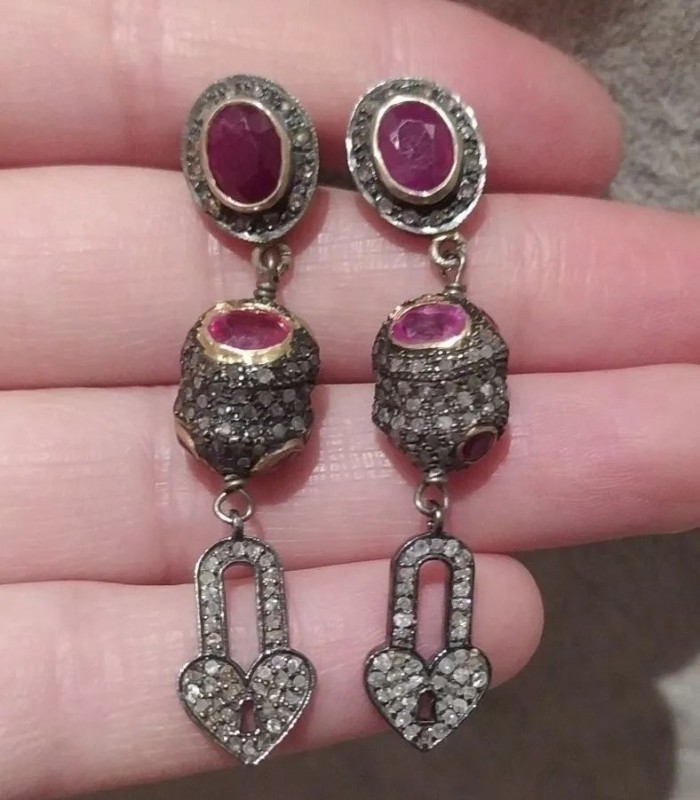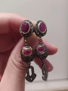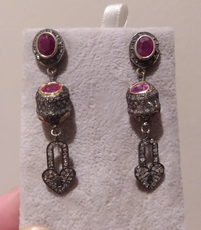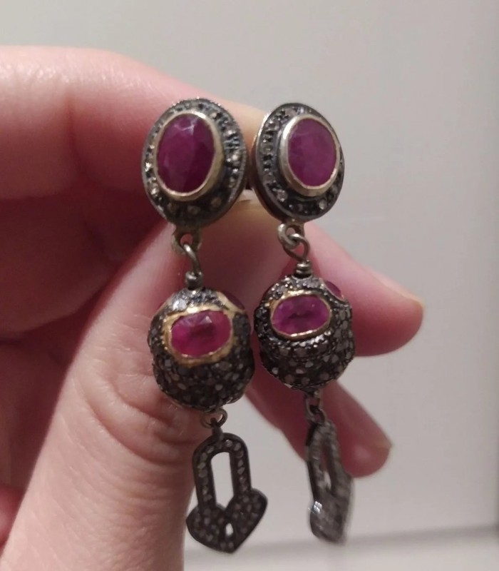 Orjinal Elmas ve Yakut Gümüş Sallantılı Tasarım Küpe.