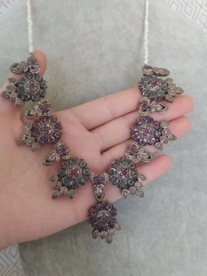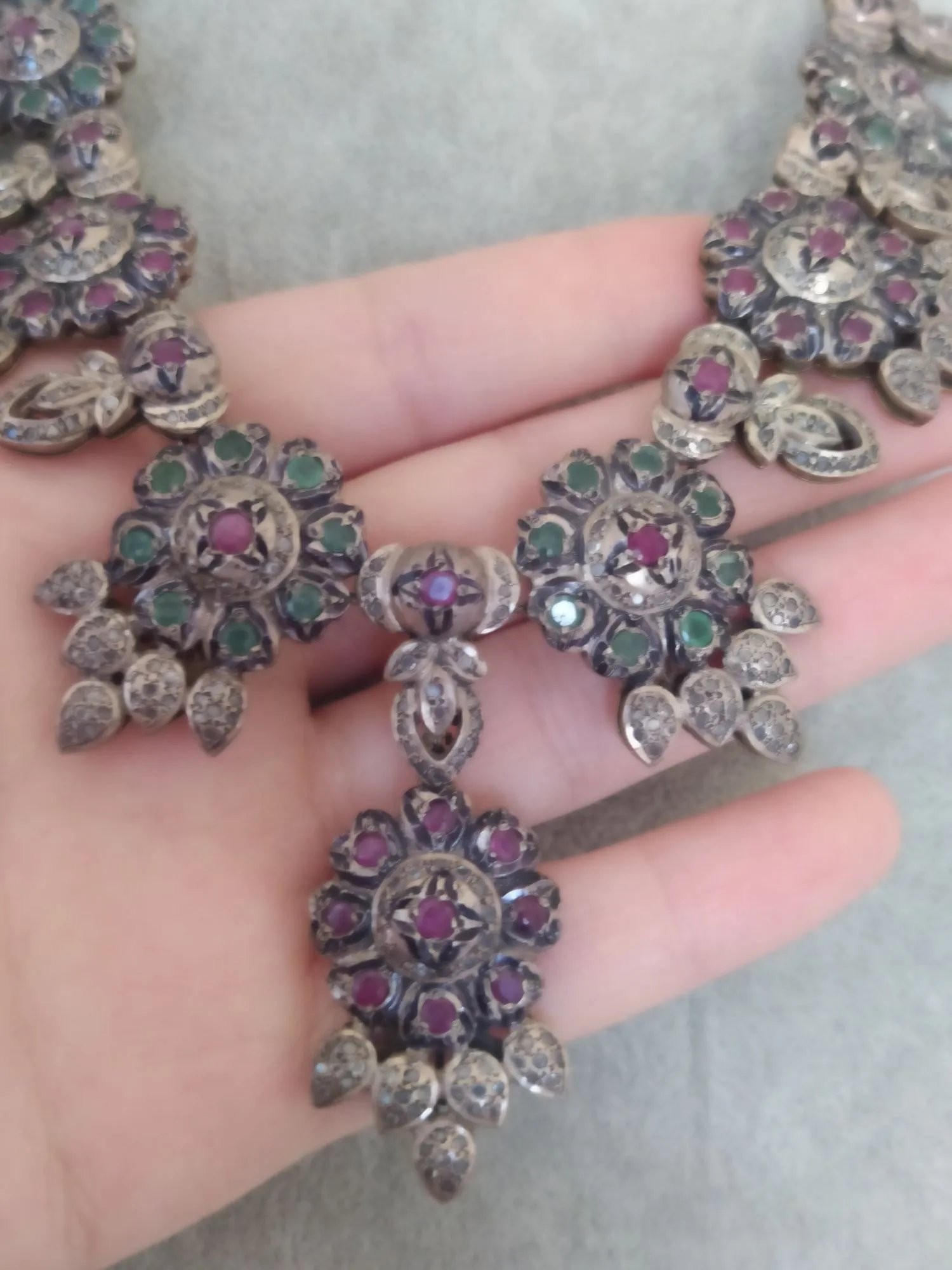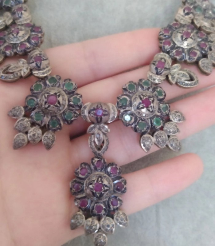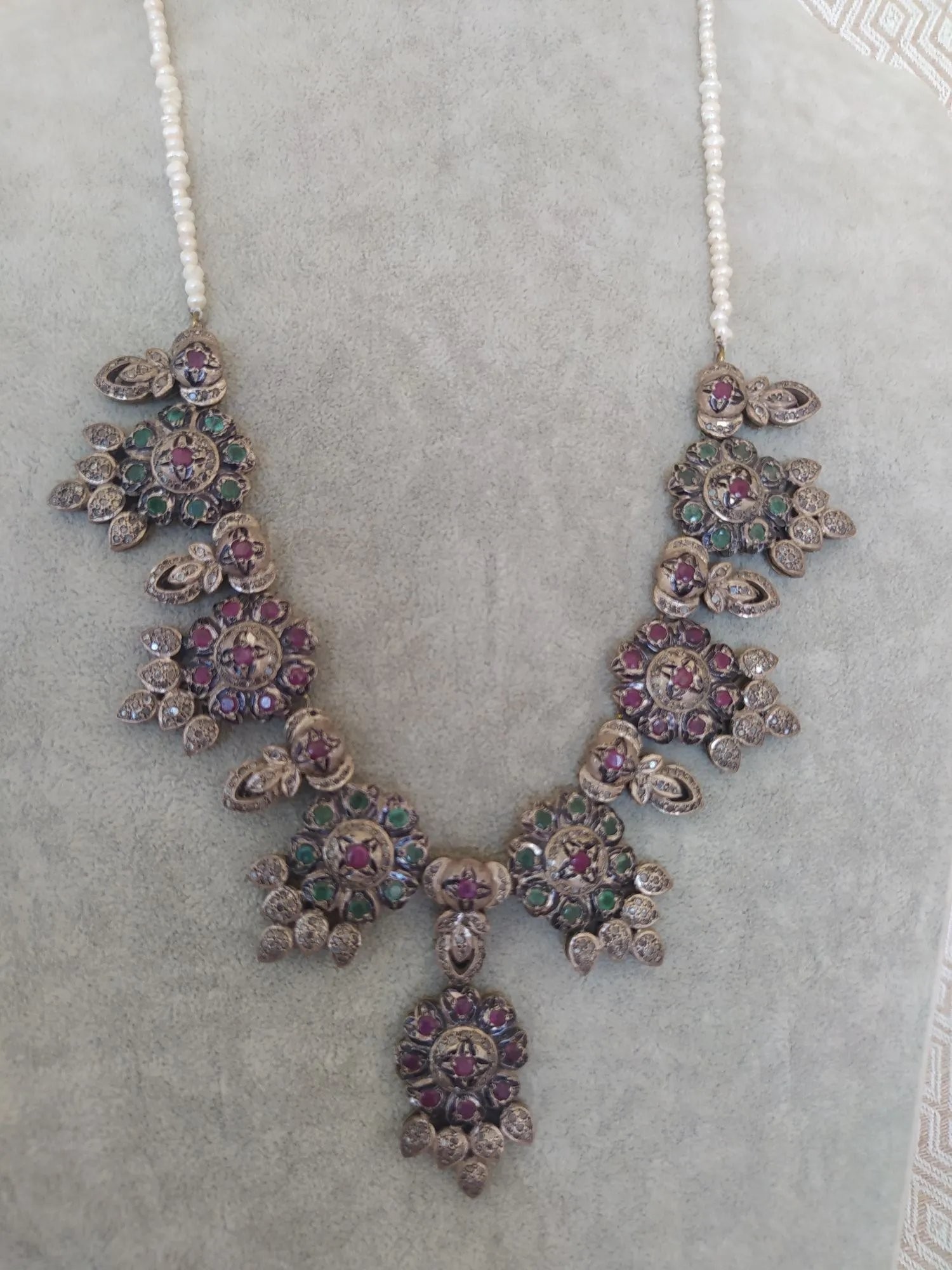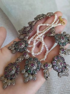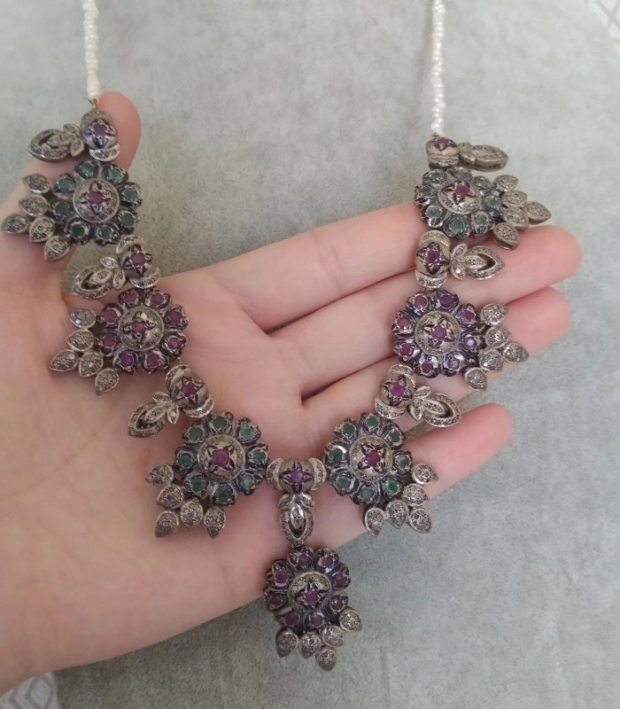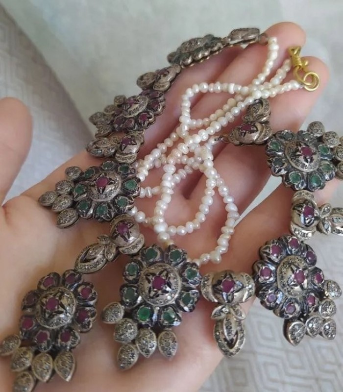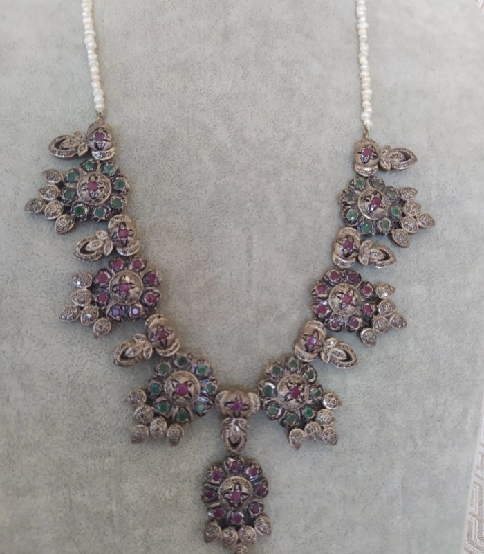 Doğal Yakut Zümrüt Taşlı ve İnci Dizili Harika Tasarım Gümüş Kolye.
