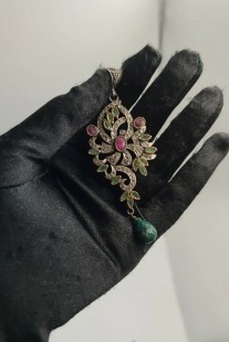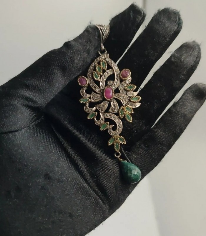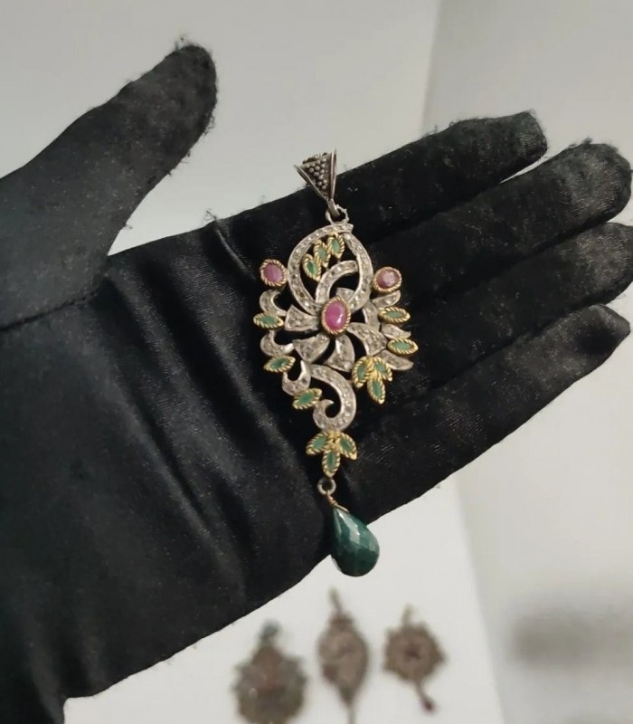 Zümrüt Ve Yakutlu Gümüş Kolye Ucu. 925 Ayar Gümüştür. İşçilikli Harika Bir Kolye.
